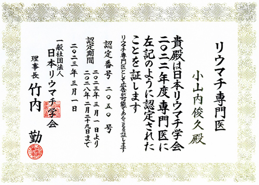 •   リウマチ専門医 認定証≫