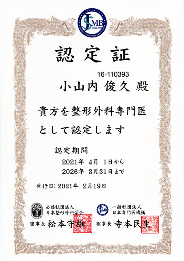 •   整形外科専門医 認定証≫