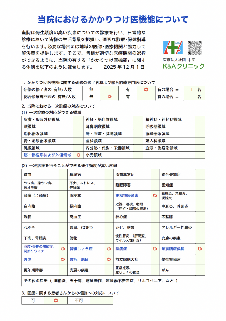 ここに,K&Aクリニックのかかりつけ医機能(対応可能な疾患)をご紹介します。