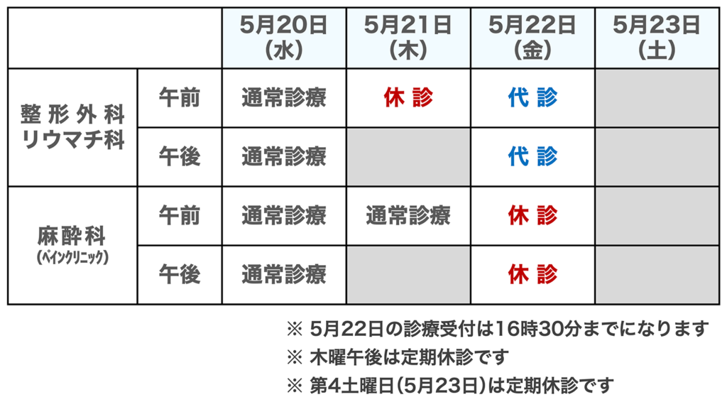 ・5月22日の整形外科外来は代診医が行います。